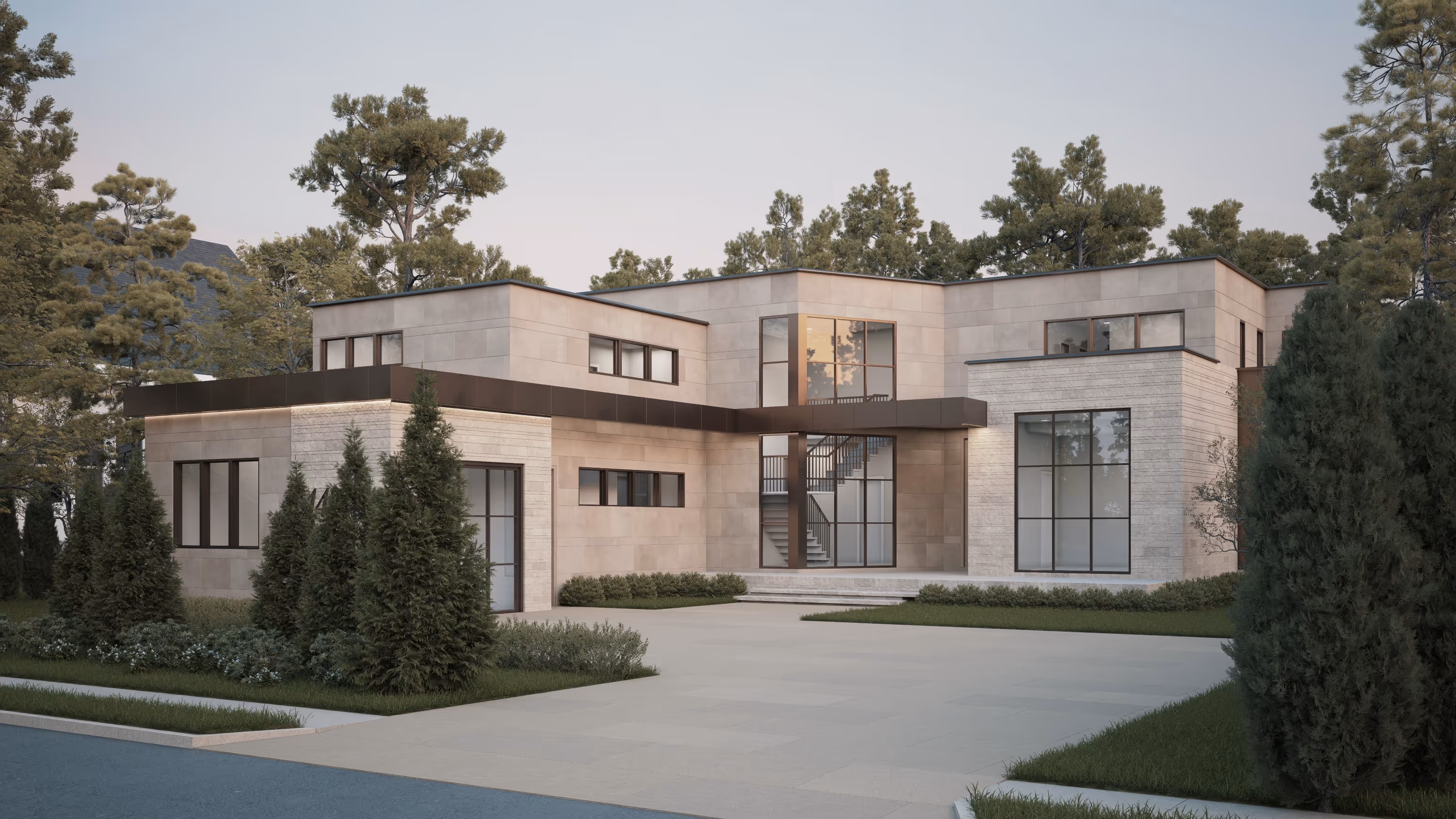 Set back from the street and surrounded by trees, this residence is a study in quiet luxury—defined not by excess, but by precision, proportion, and ease. The façade is composed entirely of limestone, expressed in two distinct cuts: smooth, large-format tile and finely textured stone. The subtle contrast in finish brings depth and rhythm to the massing, while bronze-framed glazing introduces warmth and softness against the stone.