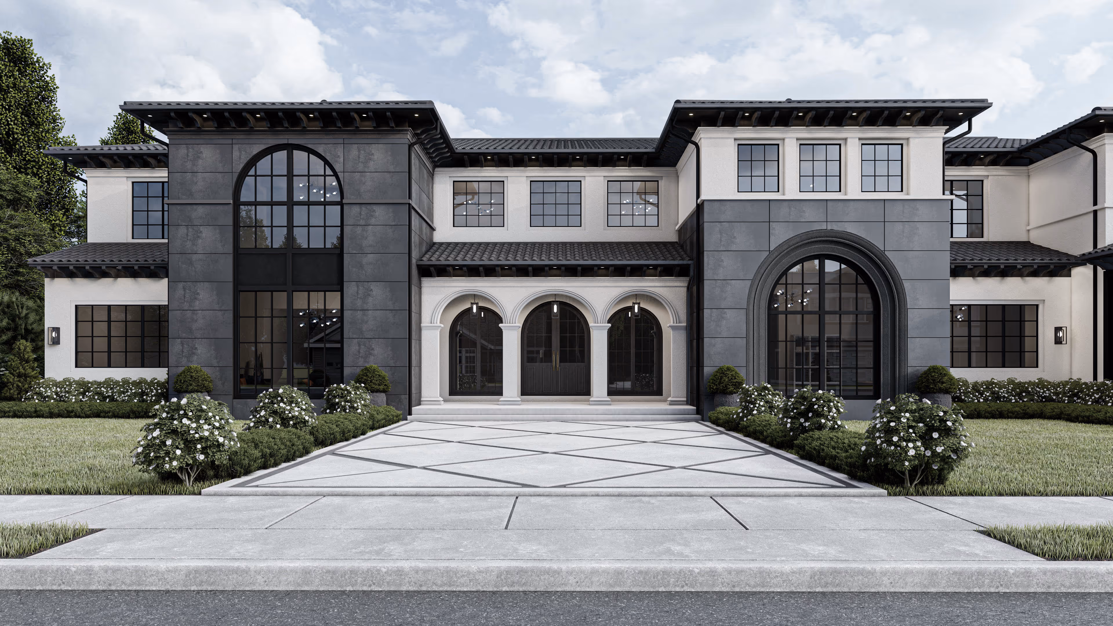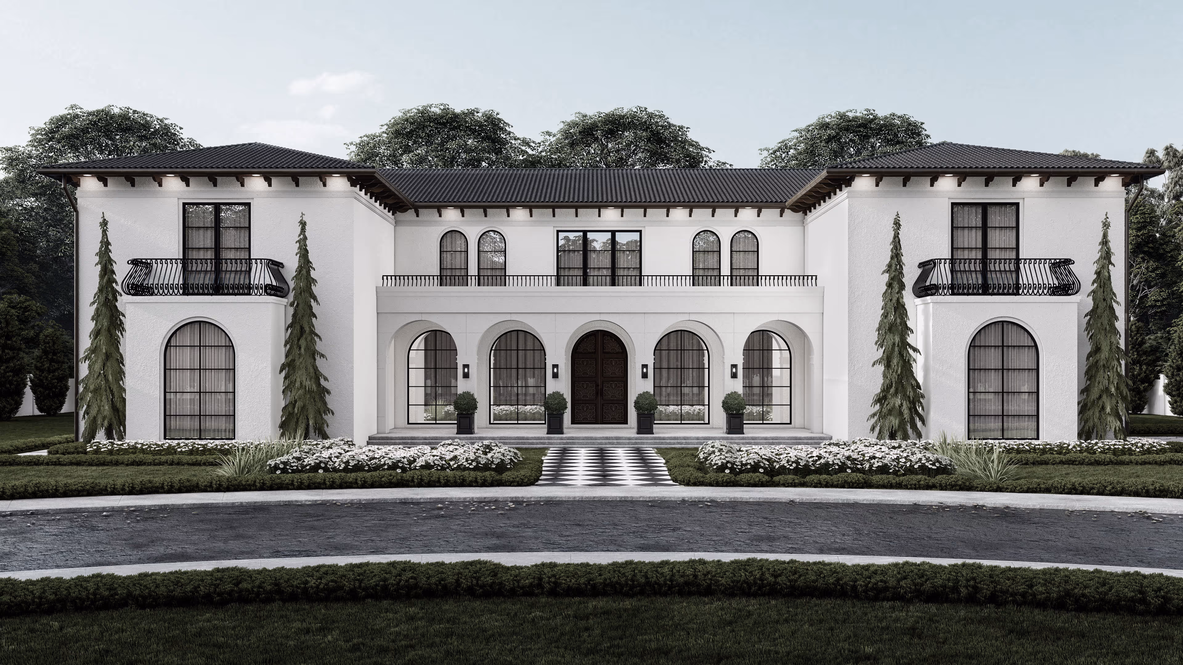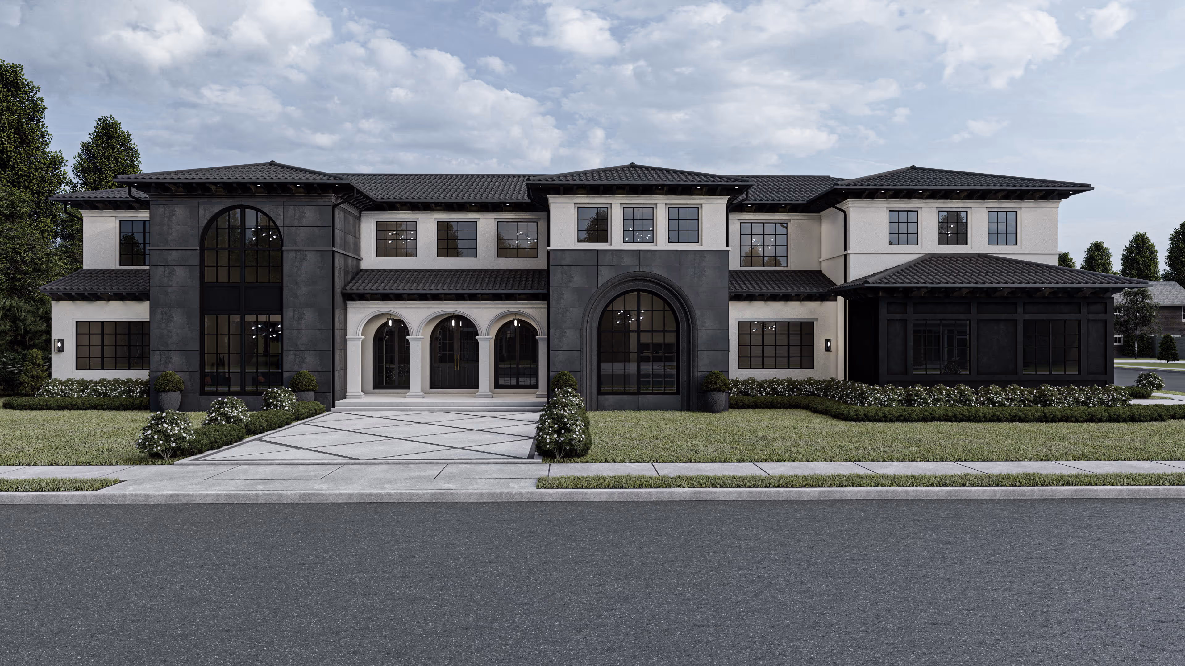 On a prominent New Jersey corner, the home presents a formal, composed façade to the street, then unfolds into a private, family-focused retreat at the rear. Inspired by contemporary Mediterranean architecture, arched openings, deep eaves, and a rich palette of stone, stucco, and ironwork give it presence and character.