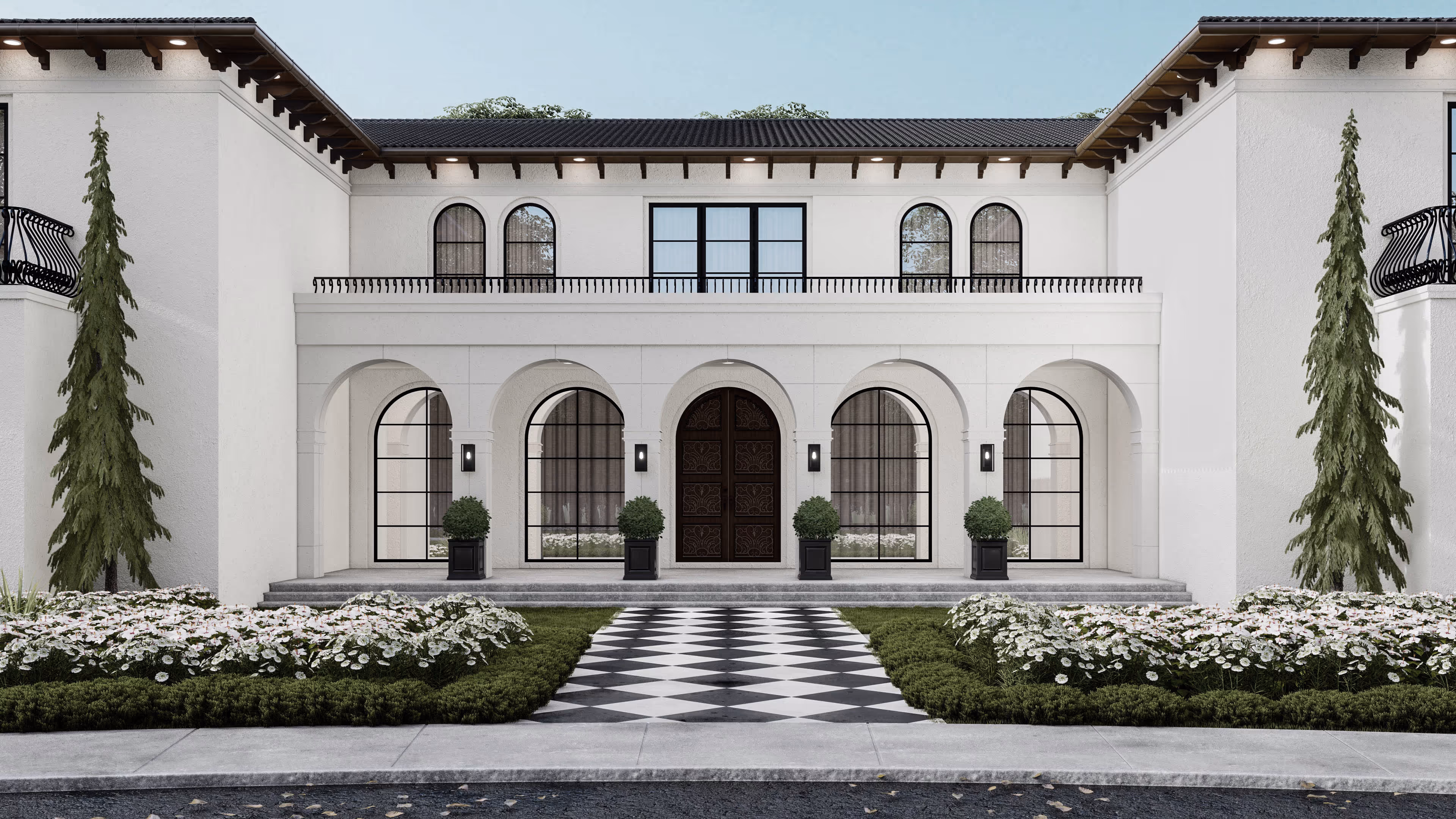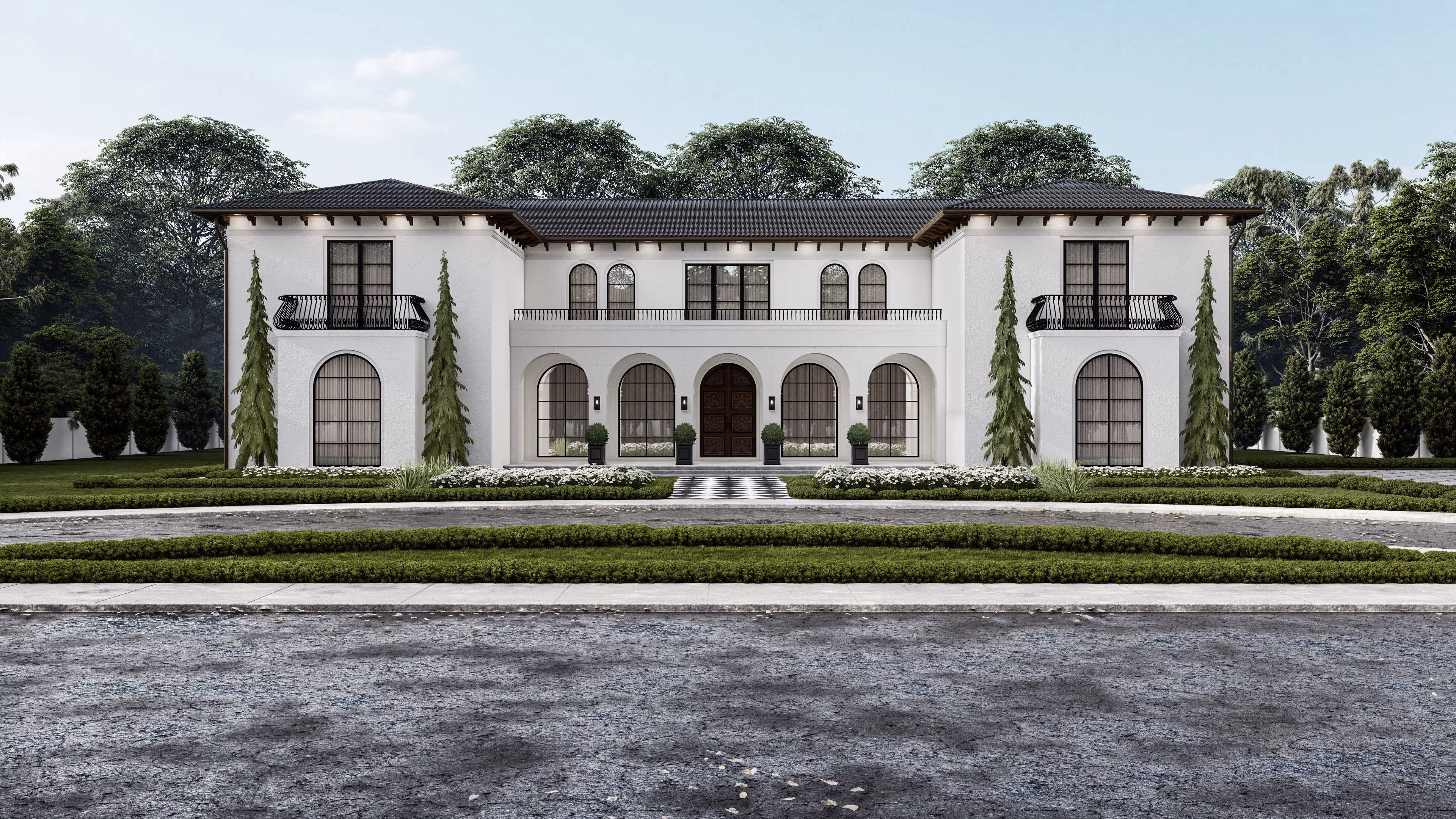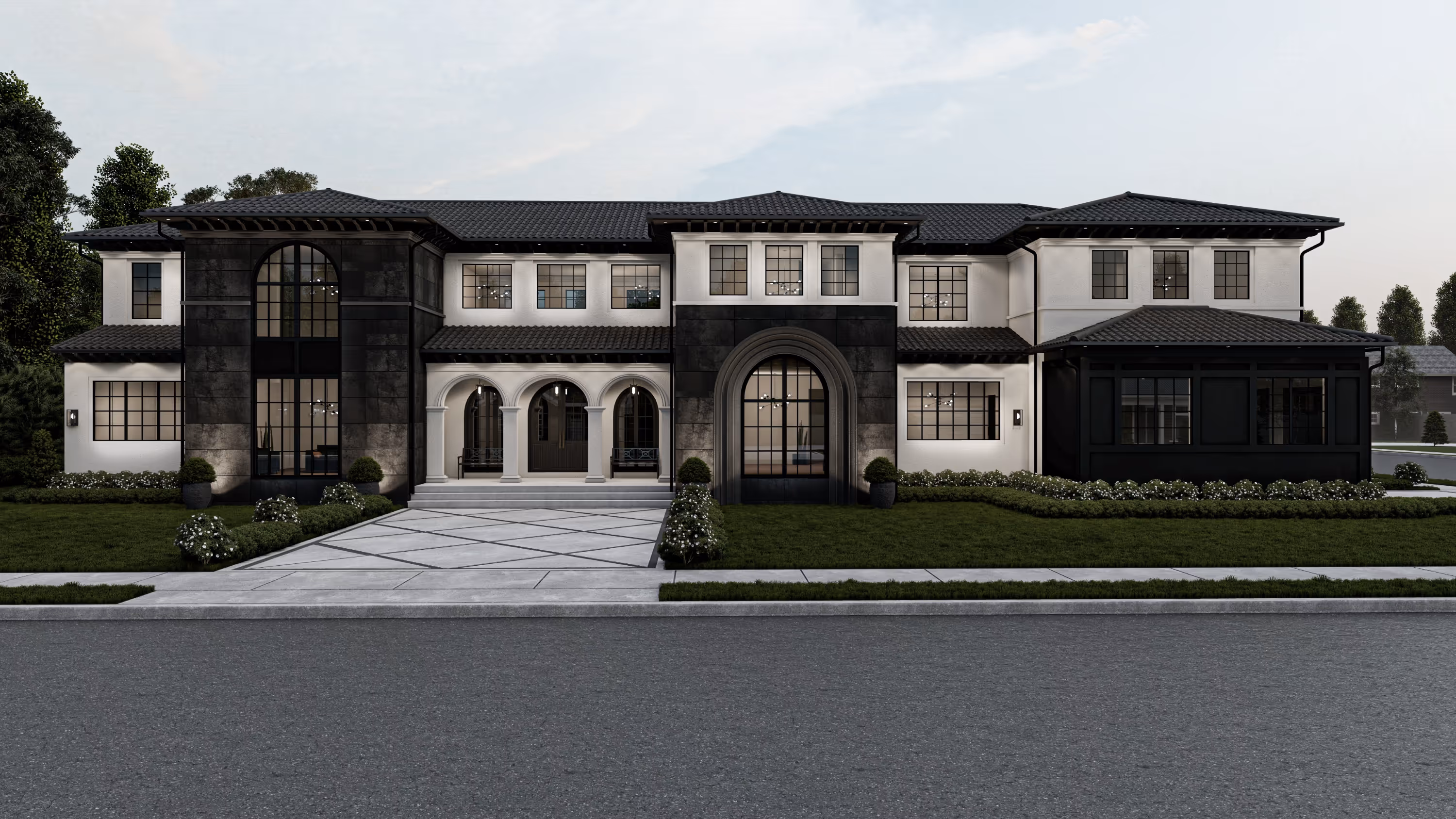 On a prominent New Jersey corner, the home presents a formal, composed façade to the street, then unfolds into a private, family-focused retreat at the rear. Inspired by contemporary Mediterranean architecture, arched openings, deep eaves, and a rich palette of stone, stucco, and ironwork give it presence and character.
