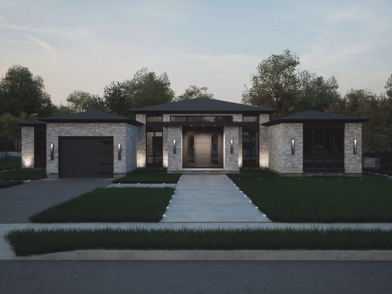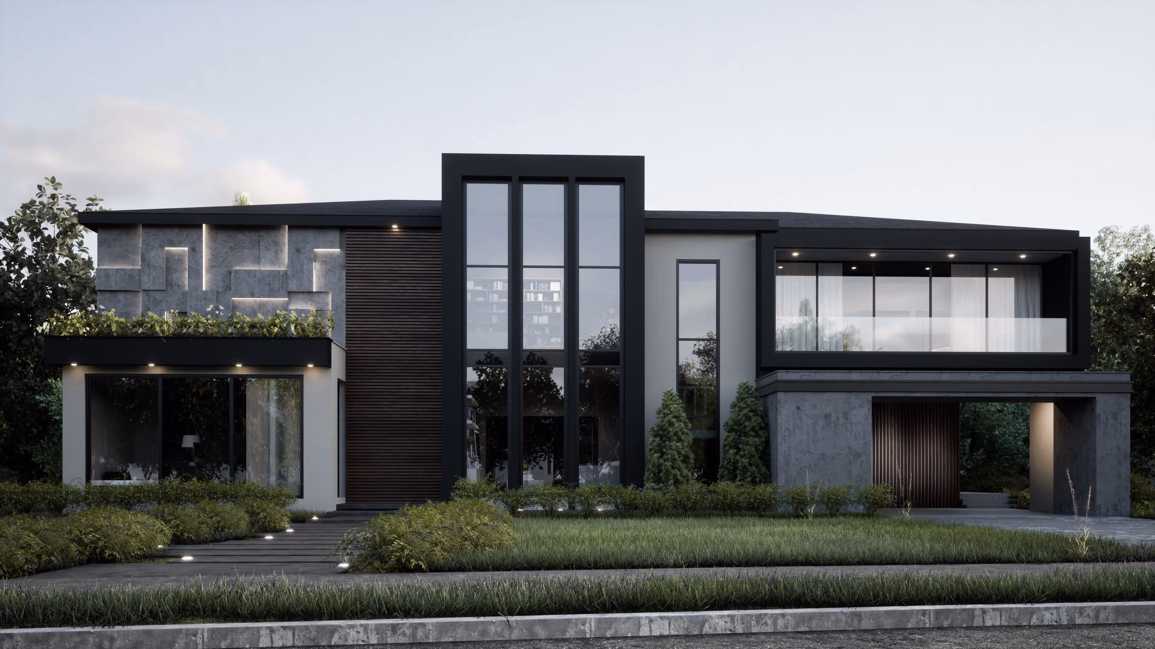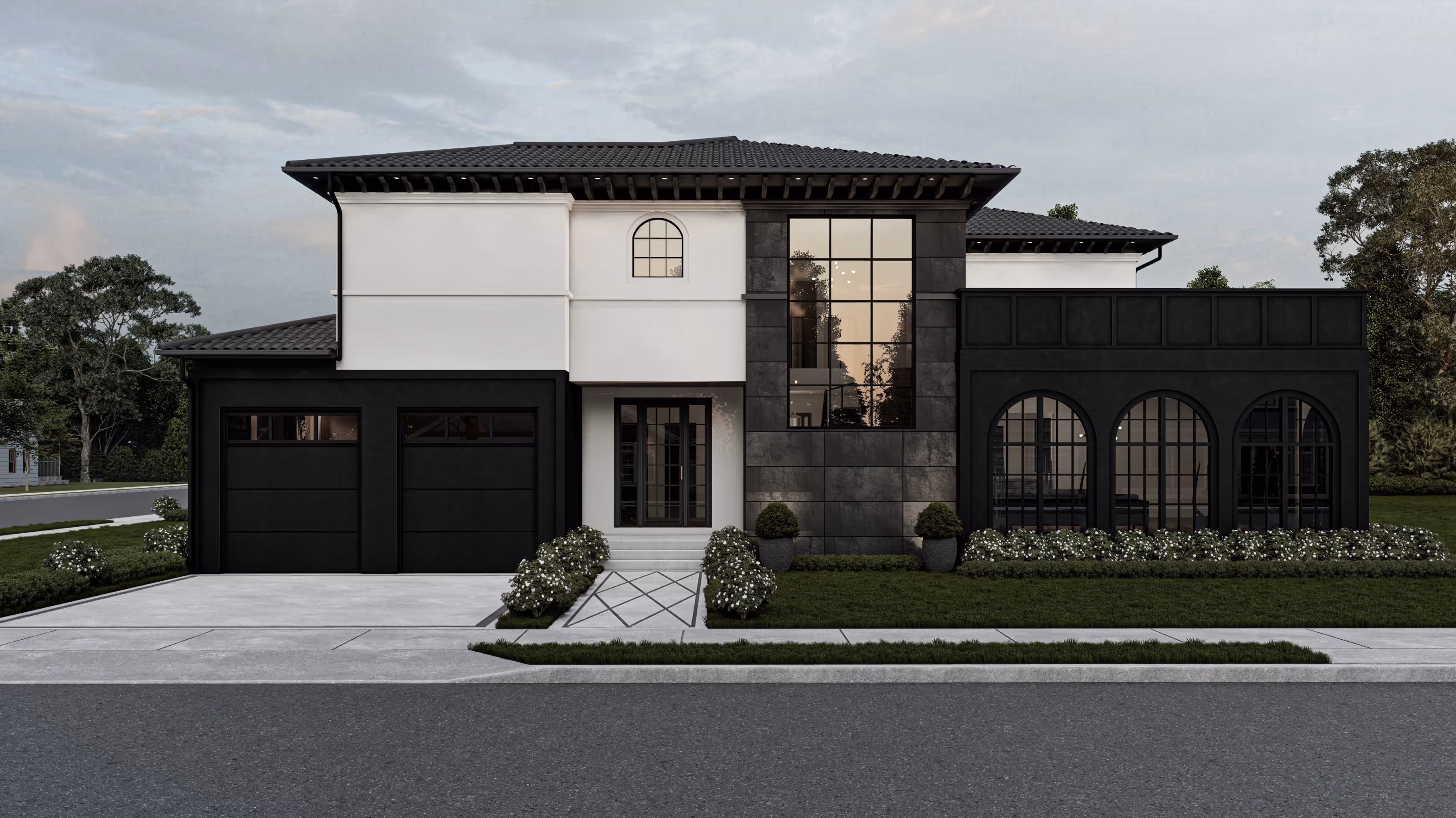 A bold, modern take on the farmhouse vernacular, this home plays with contrast, form, and proportion to create something both grounded and striking. The asymmetrical façade is composed of layered volumes and intersecting materials—matte black panels, textured concrete, crisp white stucco—all working together to heighten depth and drama.