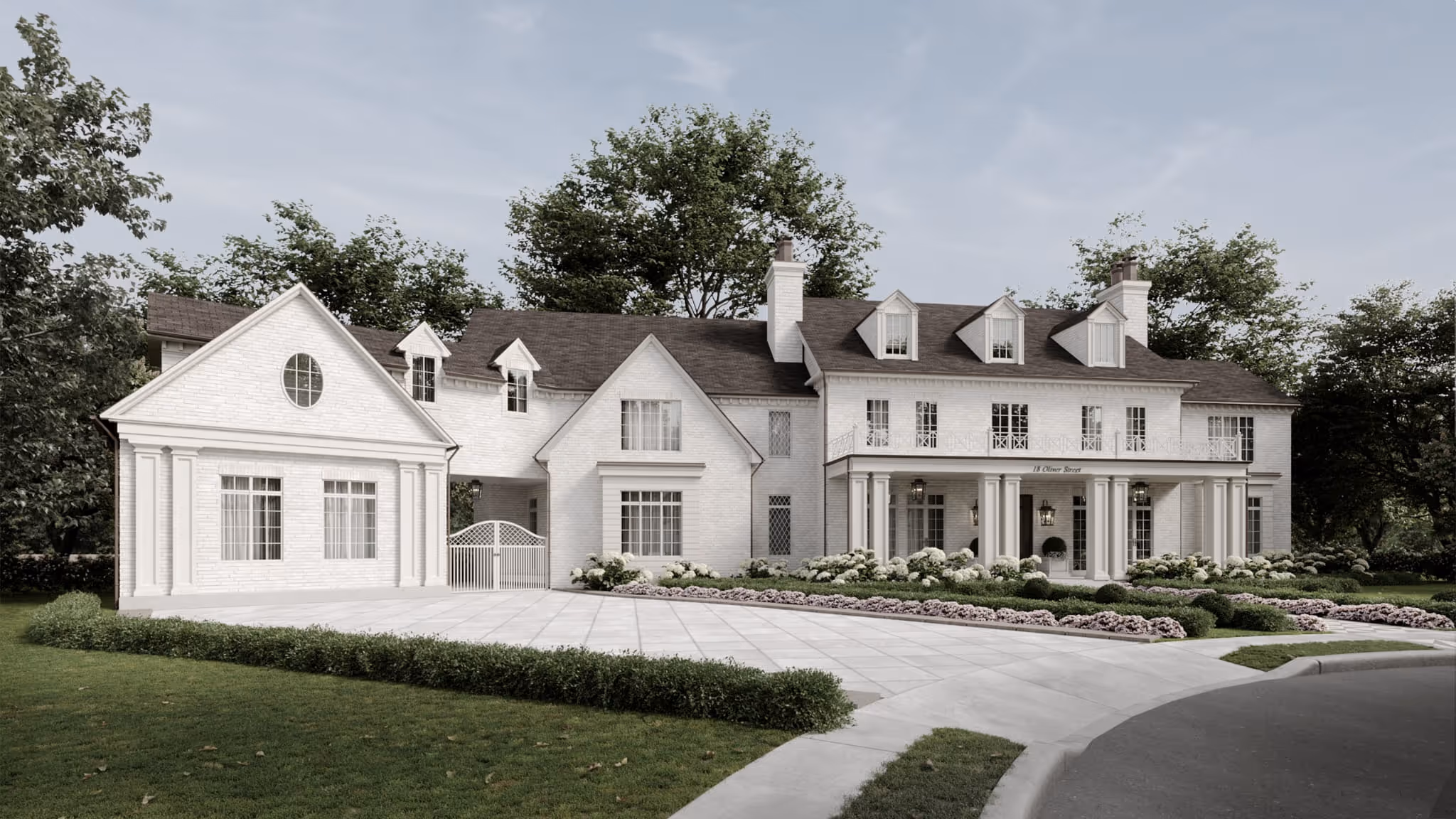This suburban home balances rooted formality with refined, private living. A covered porch anchored by classical columns and softened with layered plantings sets the entry tone. The white-painted brick façade conveys clarity and calm, while copper accents add depth and contrast.