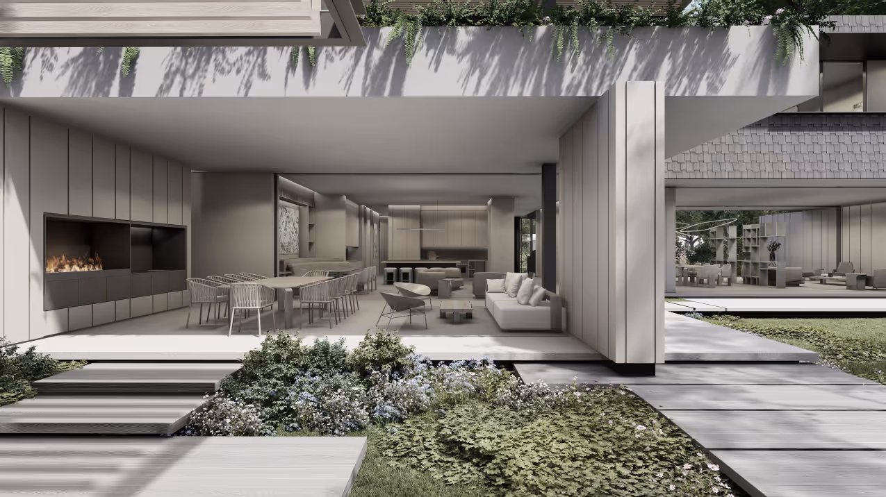 Behind the main house, a Hamptons-style breezeway connects to a tucked-away annex, allowing vehicles to disappear behind the garage and creating a secluded rear domain. Out of view from the street, the house opens fully: a covered loggia with fireplace anchors outdoor living, while family spaces flow outward—fluid, connected, and calm.