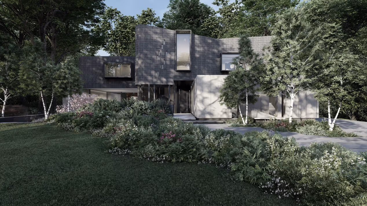 Dark curved shingles and pale vertical panels contrast among mature trees, guiding a path to the entry where the façade bends gently. A bridge crosses sunken lightwells, bringing air, sky, and daylight to the lower level so it feels expansive rather than below-grade.