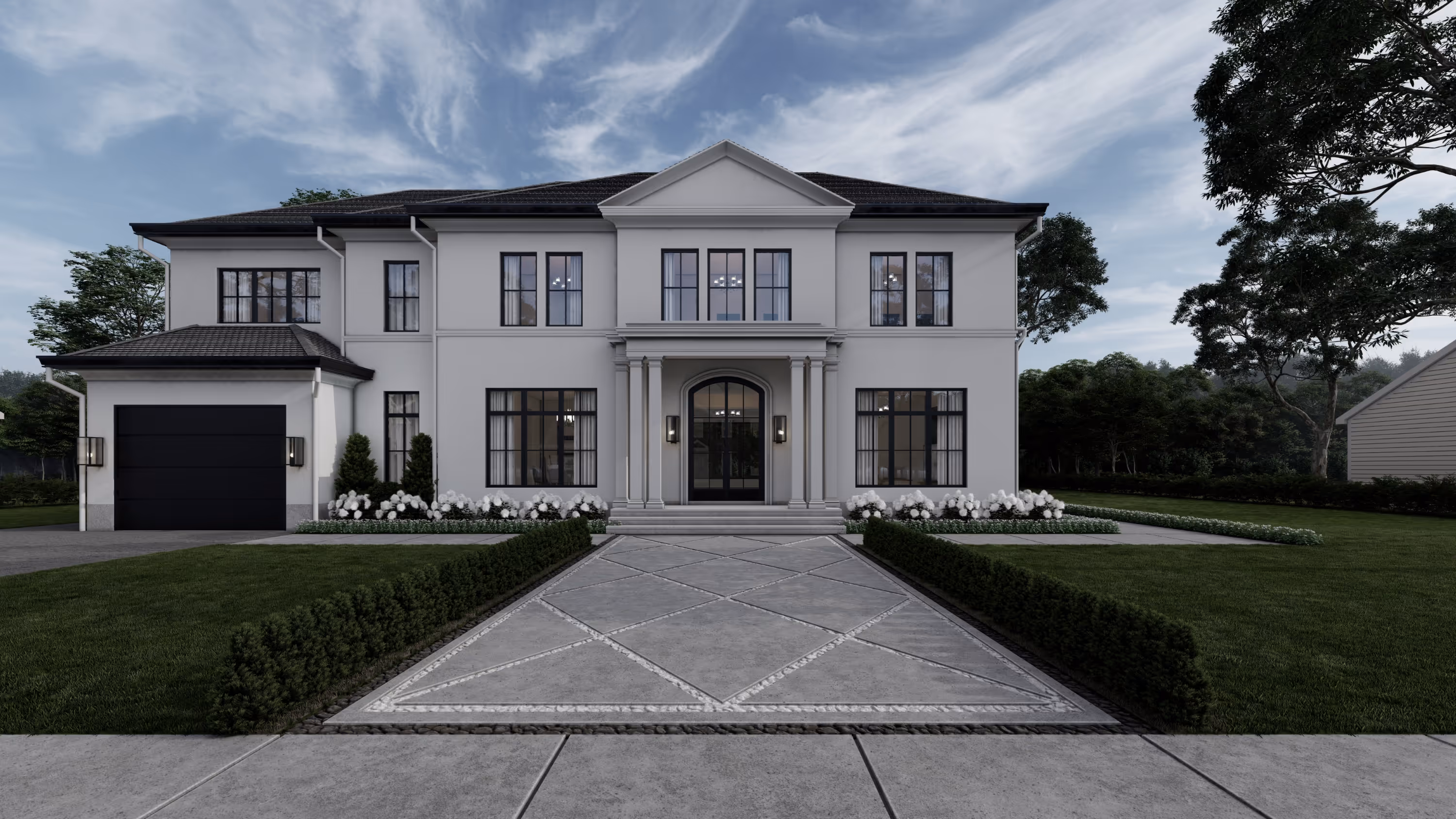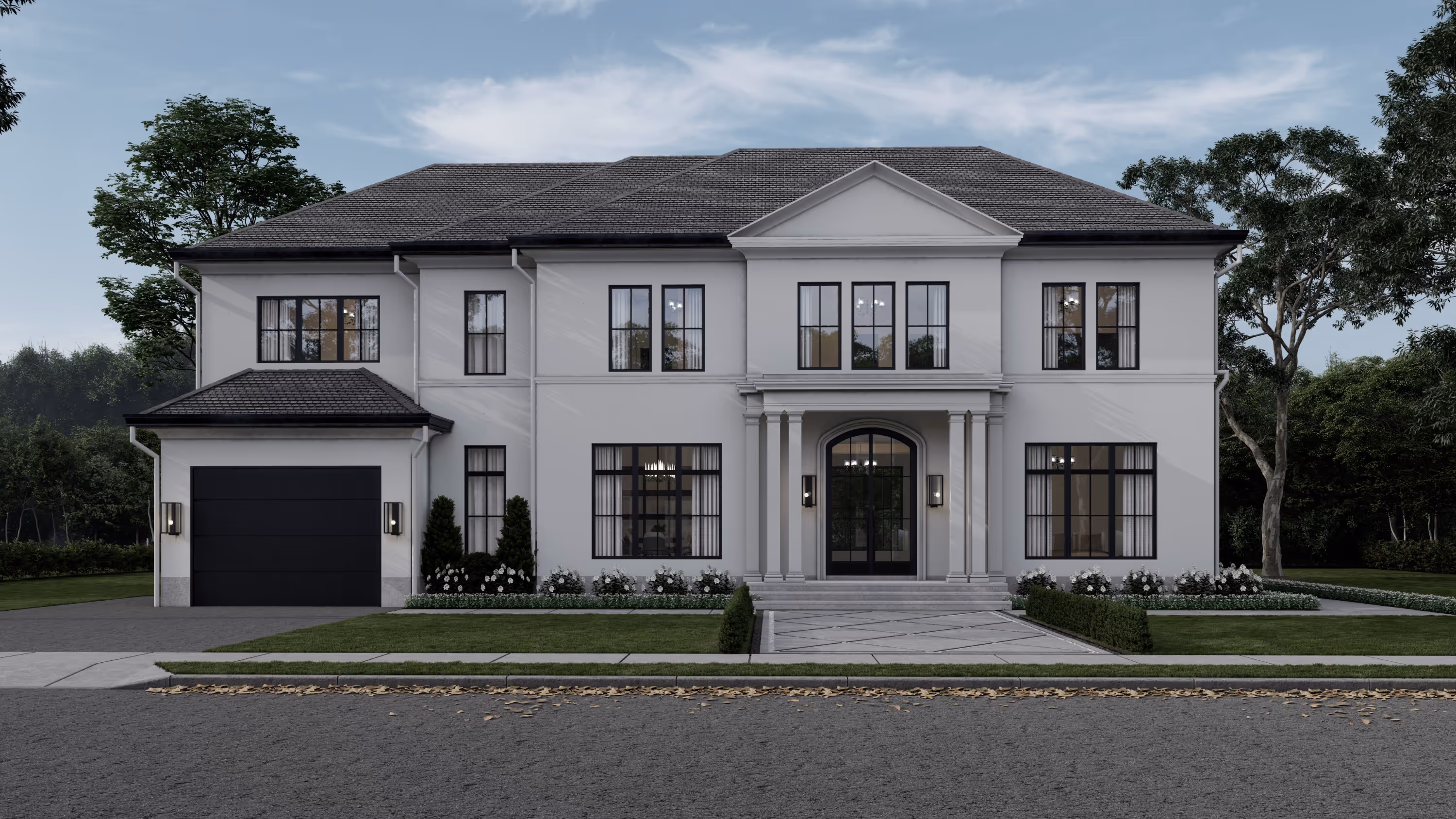 A modern interpretation of traditional formality, this residence is composed with clarity and restraint. The façade is anchored by asymmetrical composition, centered around a formal entry framed by classical columns and a gently arched transom—timeless gestures executed with a contemporary precision.